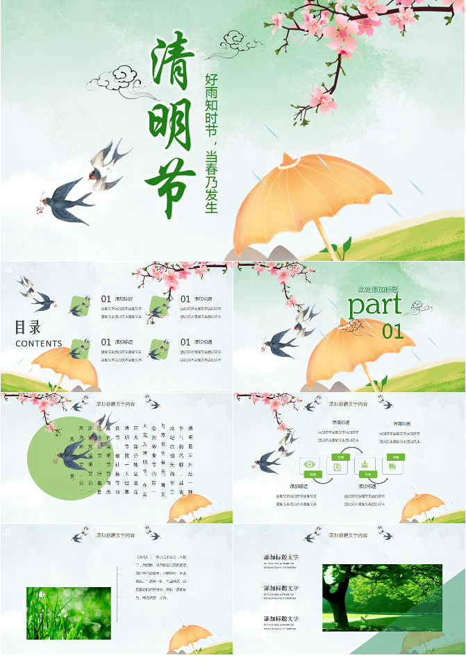 春天桃花燕子清明节PPT模板