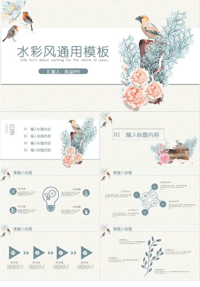淡雅复古水彩花鸟PPT模板