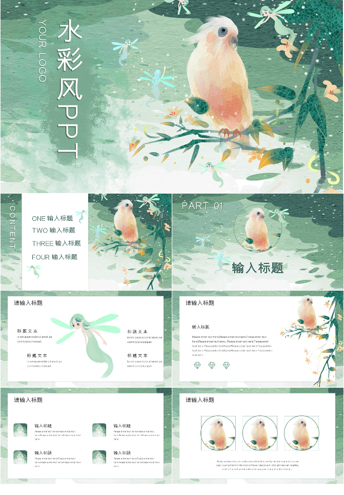 插画风森系水彩鹦鹉PPT模板