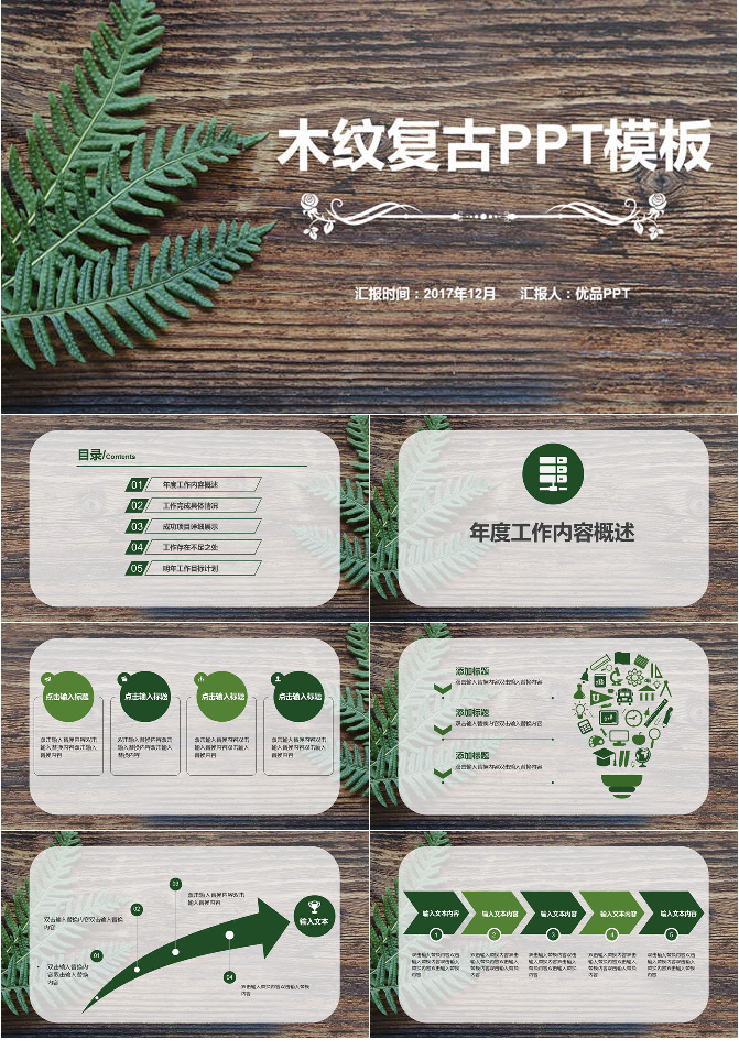 自然复古绿叶木纹PPT模板