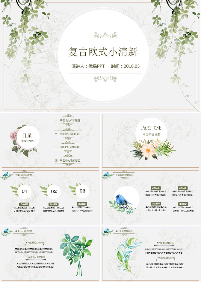 欧式复古叶子小清新PPT模板